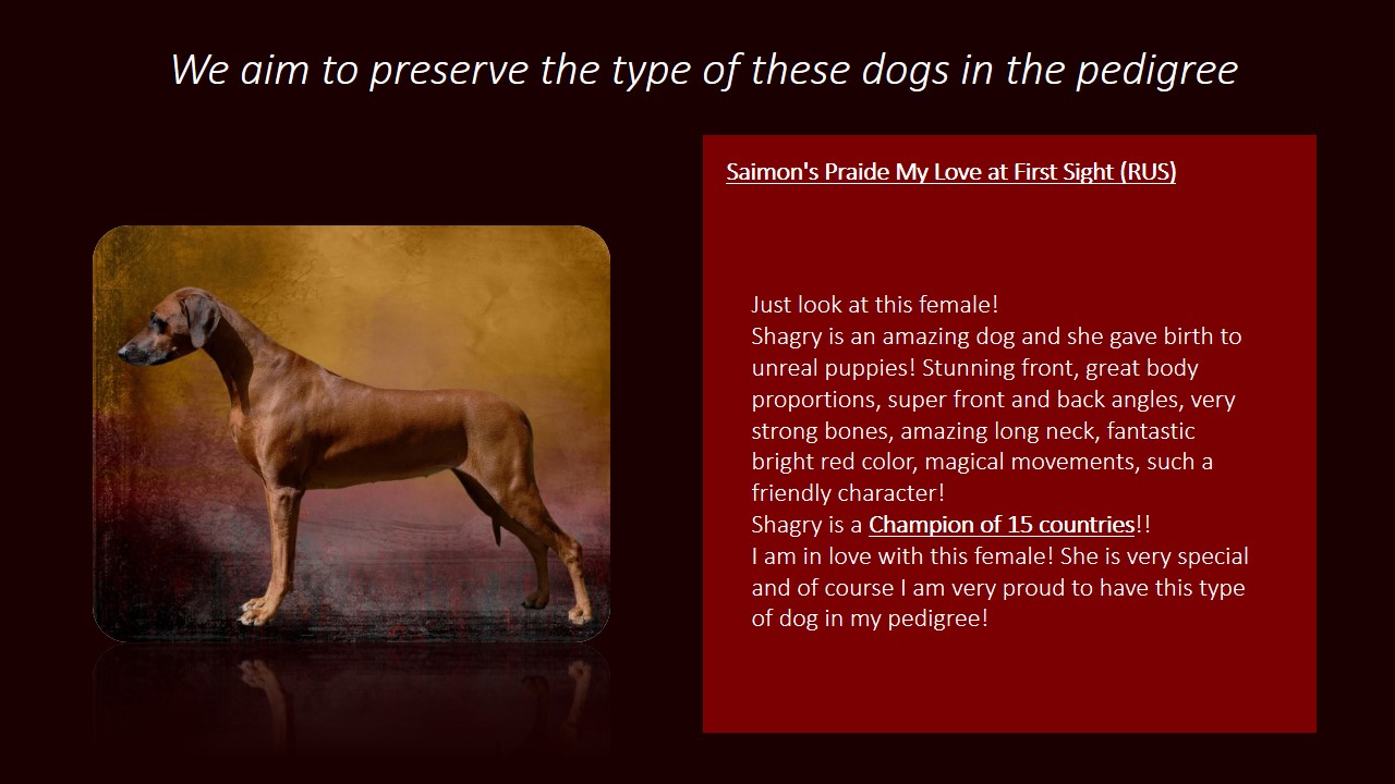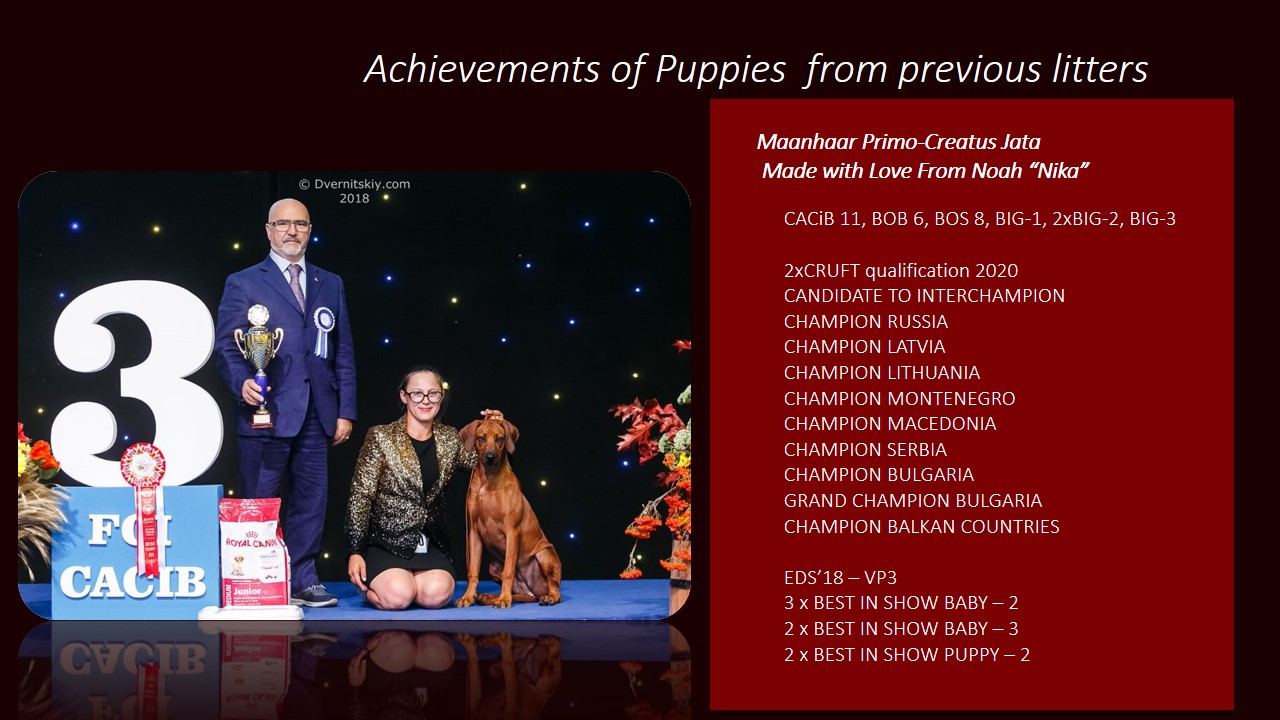 Owner: Ann Dymytrova Kaihila (kennel “Maanhaar Primo-Creatus”)